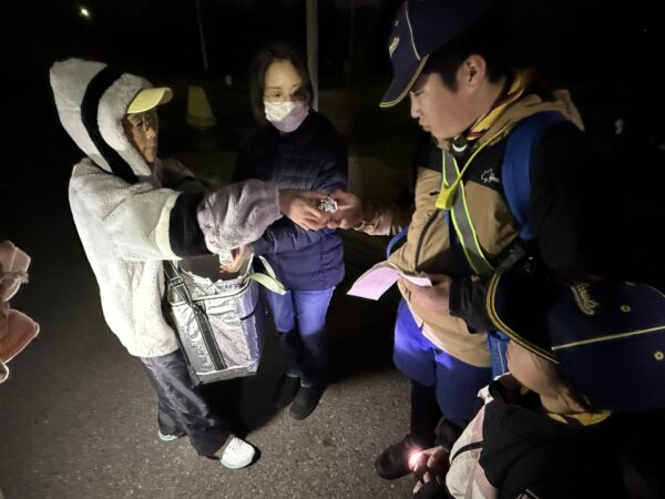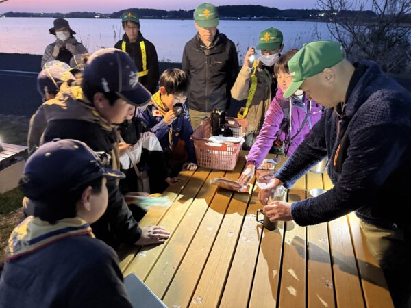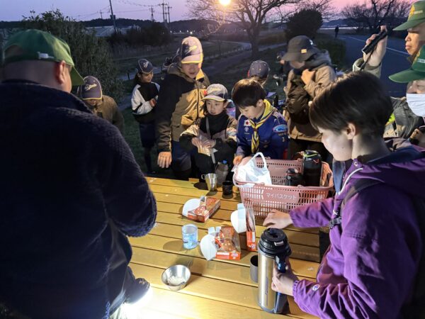日が落ち、手賀沼を半周する長丁場。冷え込んできた夕食タイム、お楽しみの「カブ弁(おにぎり)」と一緒に味わったのは、温かいオニオンスープです。 実はこれ、インスタントなのですが、お湯はリーダーたちが自宅から準備して持ってきた熱々のもの! 「あぁ、あったまる……!」「おいしすぎる!」 魔法瓶から注がれる湯気とスープの香りに、心も体もホッと解きほぐされた瞬間でした。